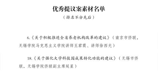 同时,校侨联副主席延星与无锡市侨联共同提交的《关于强化大学科技园成果转化功能的建议》也作为优秀素材名列其中。该建议围绕高校科技资源与地方产业对接,提出了提升成果转化效率、服务创新驱动发展的具体路径,彰显了我校在促进产学研融合、服务区域创新体系建设中的积极作用。