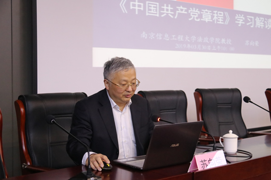 校本部法政学院苏向荣教授讲述本次培训班第一课---《中国共产党章程解读》。苏向荣教授从政党起源、党章的修订和演变过程等六个方面进行了讲解,他详细介绍了党章的重点条例,并勉励在座学员端正入党动机,陶冶自身情操,提升自身修为,早日达到共产党员标准。