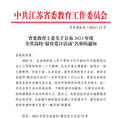 江苏省委教育工委日前公布了全省2023年度高校“最佳党日活动”优胜奖评选结果,我校物联网工程学院党总支“党建引领‘五维’联动融智物联赋能致远”和大气与遥感学院党总支“大气大为强党建 笃志笃行育英才”两项主题党日活动获“最佳党日活动”优胜奖。